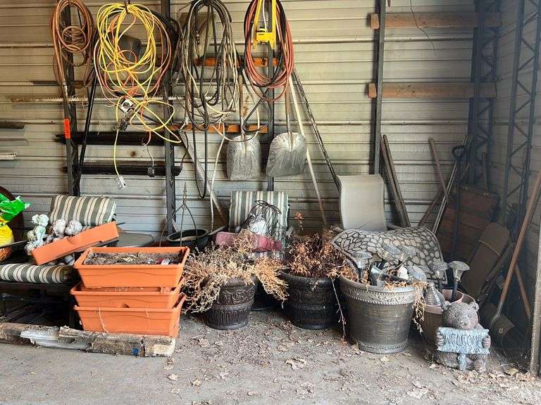 This lot is primarily patio furniture, planters, shovels, yard tools, misc electrical, post pounder and other misc.